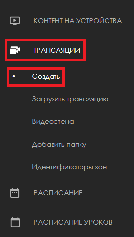 Пример отображения раздела "Трансляции" и категории "Создать" в личном кабинете