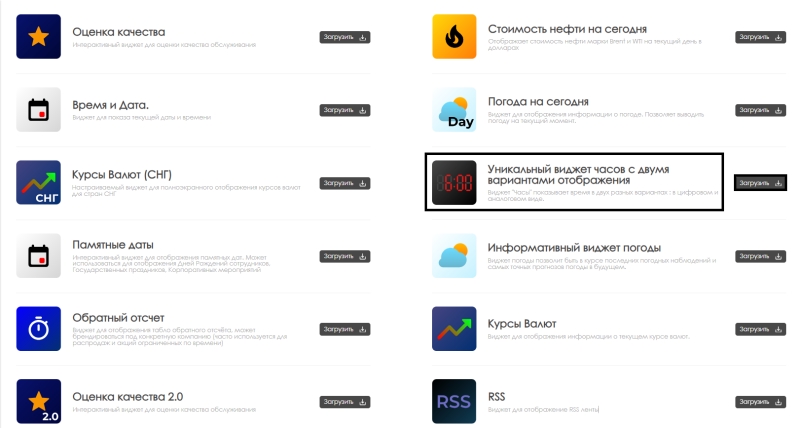 В данном разделе пользователь должен найти данный виджет и загрузить его.