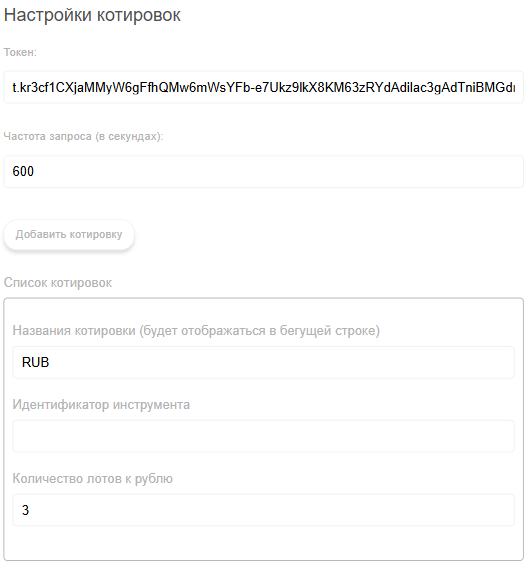 ** Quote name - specify name for quote configuration; ** Instrument ID - enter instrument ID received via API; ** Lot to RUB ratio - specify number of lots per ruble.