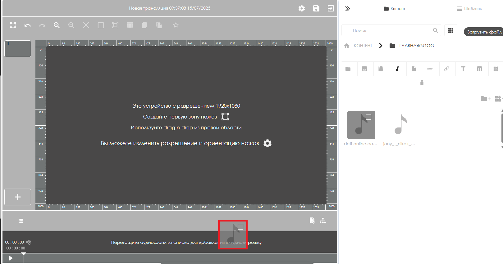Нужный контент необходимо перетянуть с помощью мыши в зону для аудио.