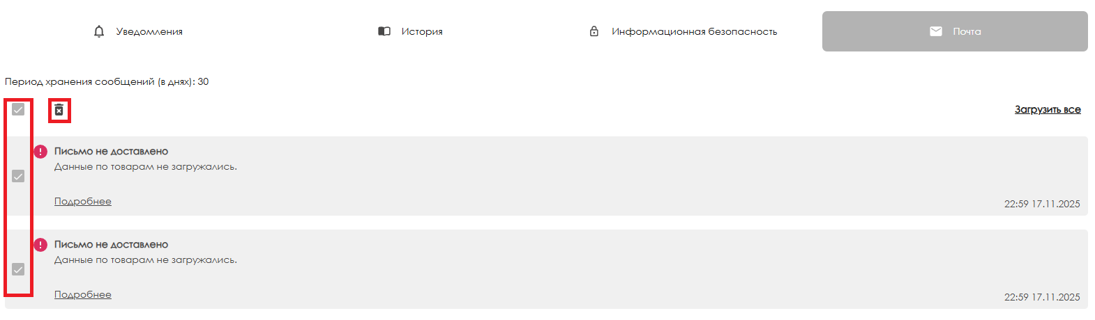 - кнопка «Загрузить все» — выгружает все уведомления в блок «Почта»;