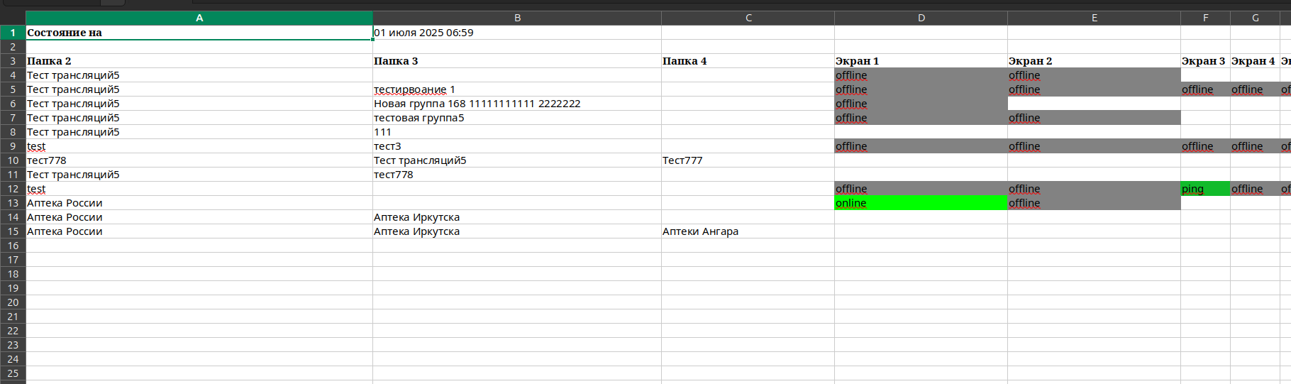 - Статус отчета - показывает статус сформированного отчета (зеленый - отчет сформирован успешно, красный - ошибка при формировании отчета).