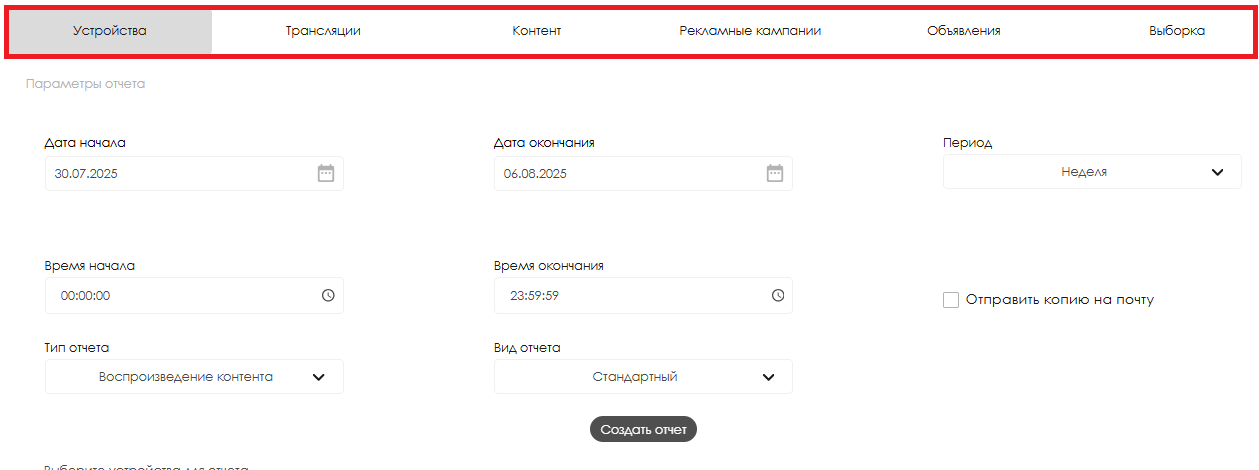 Весь раздел поделён на несколько рабочих зон, позволяющих выбрать какой формат отчета необходим и от какого устройства должен поступить отчет.