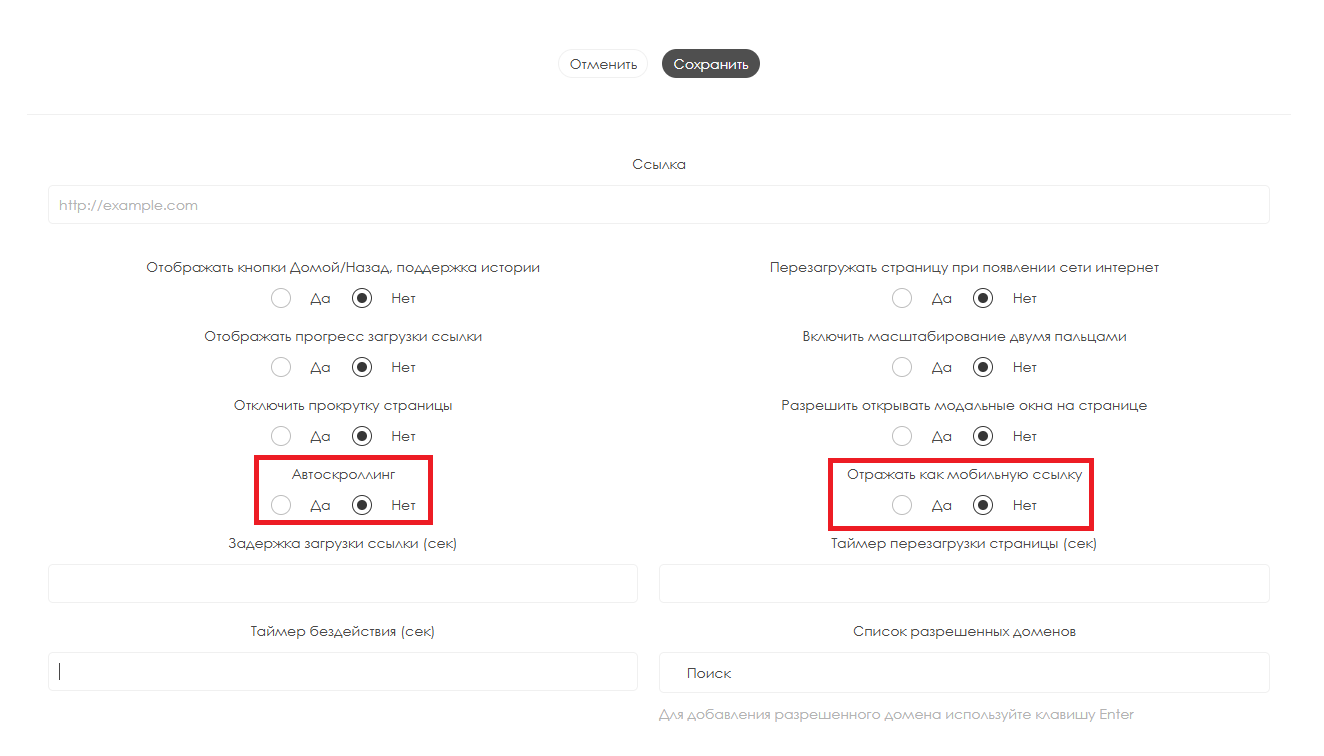 - Автоскроллинг — позволяет включить настройку автоматической прокрутки созданного контента в формате ссылки. Активируется с помощью переключателя (Да / Нет);
