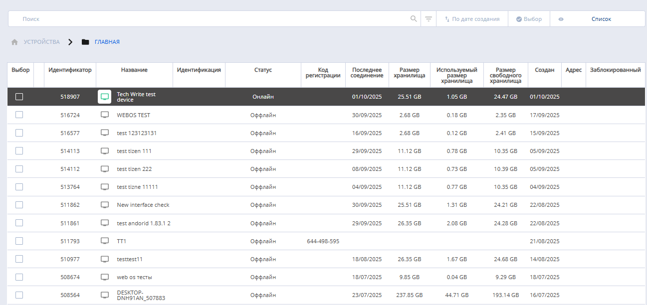 - выбор — позволяет выбрать устройство с помощью чекбокса (галочки);