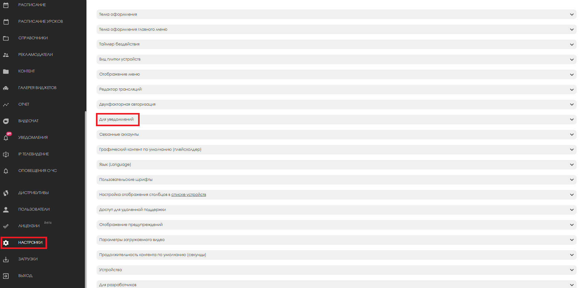 Далее перейти в раздел «Настройки» и развернуть строку «Для уведомлений».