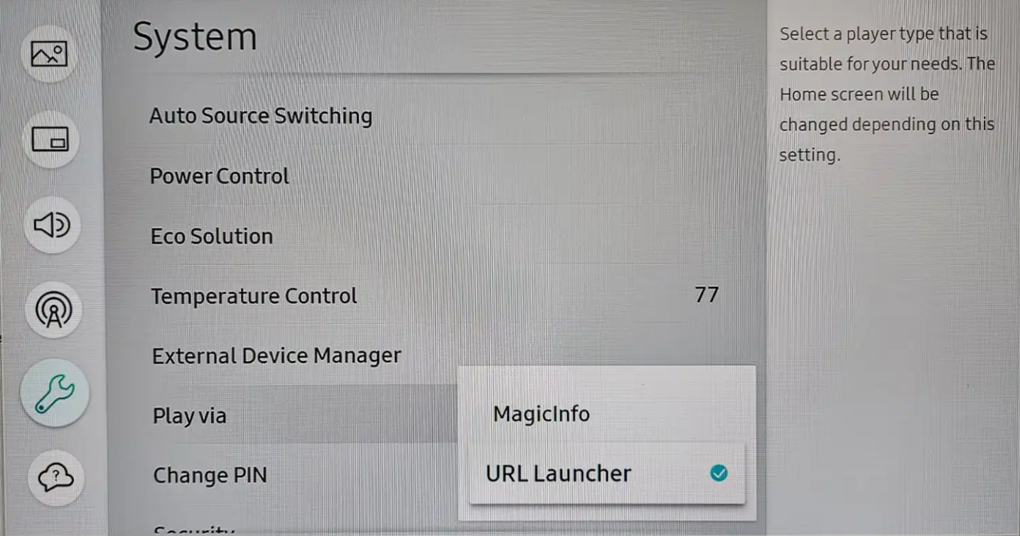 In the case of the first startup of the device (the device has not been used anywhere before), the setup wizard should appear (a greeting with a question about choosing a language). If the device was previously used with Samsung MagicInfo or other SSSP-based solution, go to "Reconfigure Device"