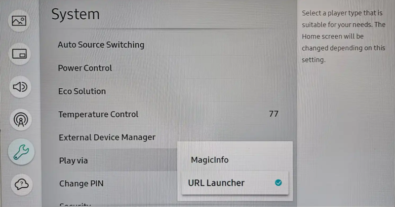 If the device was previously used with Samsung MagicInfo or other SSSP-based solution, go to "Reconfigure Device" | If the device was previously used with Samsung MagicInfo or other SSSP-based solution, go to "Reconfigure Device" | ||