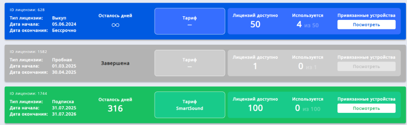 - кнопка «Просмотреть» привязанные устройства (при клике открывает страницу со списком привязанных к лицензиям устройств).