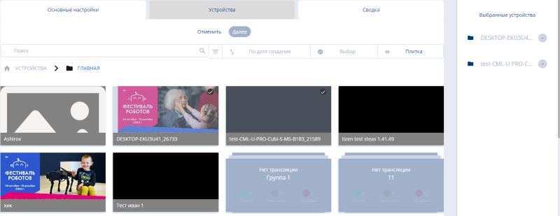 В зоне устройств можно выделить устройство или устройства на которые будет применен контент. | В зоне устройств можно выделить устройство или устройства, на которые будет применен контент. | ||
