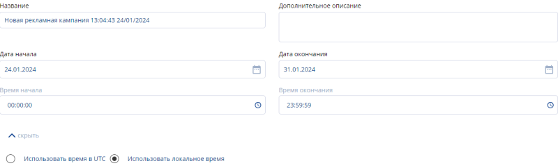 - Установка времени - можно выбрать время, которое будет использоваться в рекламной кампании: локальное или время в формате UTC.