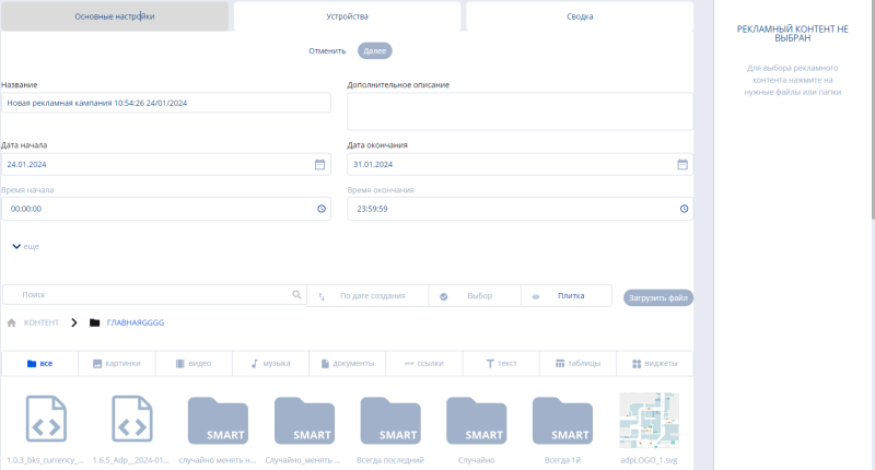 В блоке "Основные настройки" пользователи могут выставить параметры, а также найти и выбрать контент для кампании.