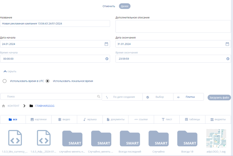 При нажатии на клавишу "Загрузить файл" пользователь может загрузить контент для рекламной кампании с устройства.