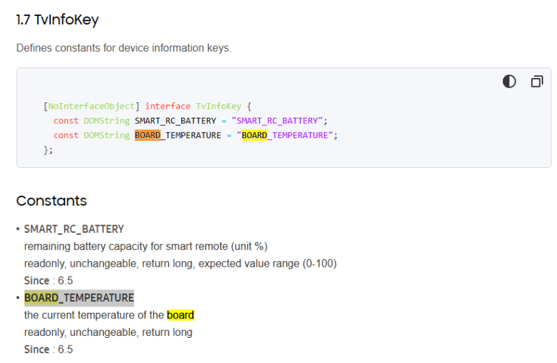 Информацию о температуре CPU (процессора) устройства можно найти в значении <code>"BOARD_TEMPERATURE"</code> на странице описания API's от производителя Samsung.<br> | |||