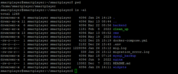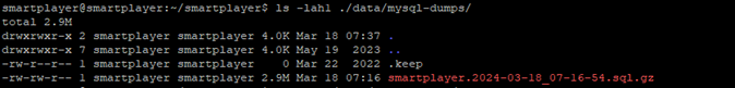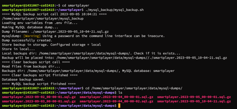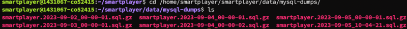 cd /home/smartplayer/smartplayer/data/mysql-dumps/- позволяет пользователю использовать папку где хранятся бэкапы$ls- показывает все хранящиеся файлы