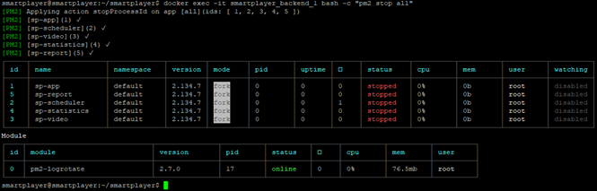 <code>docker exec -it smartplayer_backend_1 bash -c "pm2 stop all"</code> | <code> docker exec -it smartplayer_backend_1 bash -c "pm2 stop all" </code><br> | ||