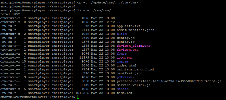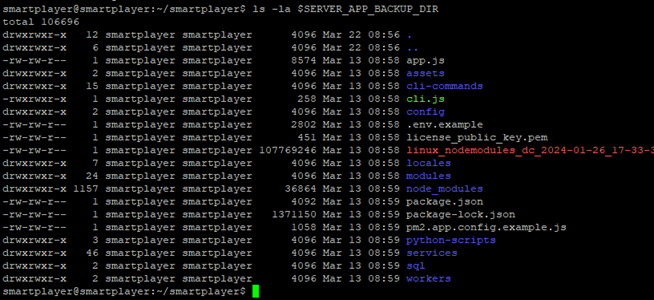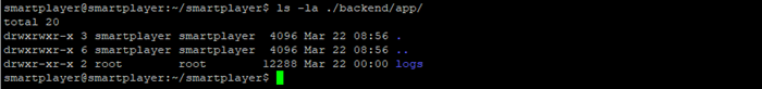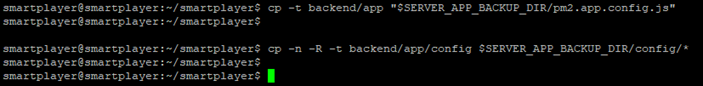 В процессе выполнения команды появится сообщение о невозможности переноса папки backend/app/logs из за отсутствия прав на нее, потому что доступ к папке имеет пользователь с root-правами. Такое сообщение появляется, если выполнять команду от имени пользователя smartplayer. Необходимость копирования папки logs отсутствует, так как после обновления сервера, логи продолжат создаваться в этой же папке. Если команда выполнена под пользователем с root-правами, тогда и папка logs будет перенесена – это надо будет учитывать, при копировании новой версии серверного приложения.