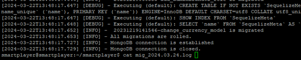 Если миграции завершились логом "All migrations are rolled.", то они выполнены успешно. Если нет, то обратиться к представителю компании SmartPlayer для дальнейший переадресации проблемы в команду разработку, чтобы выяснить причину не произошедшей миграции.