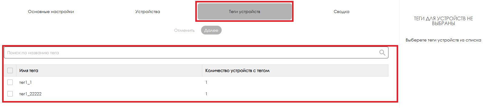 Далее переходим в блок «Устройства» (идет следующим, если кликнуть на кнопку «Далее» вверху экрана). Активируем переключатель «Выбор устройств по тегам» (обязательно прочитать описание).