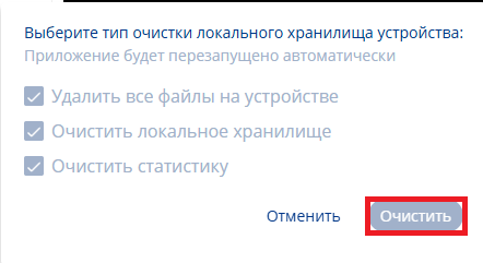 Очистить локальные хранилища - производится полная очистка базы данных. В данном случае не удаляет скачанные файлы и данные, он очищает полностью базу данных вместе со статистикой.