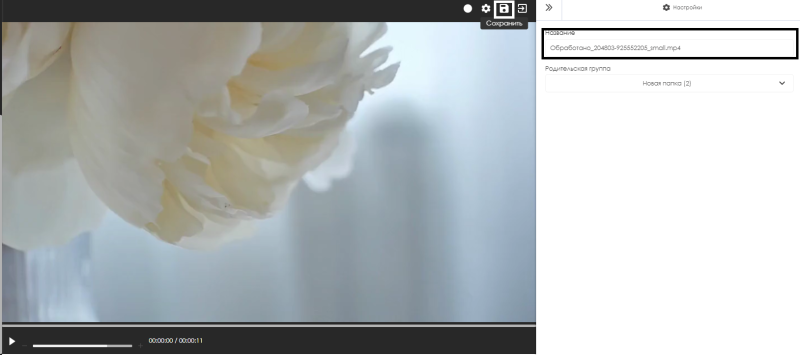 Завершив обработку видеоконтента пользователю необходимо будет нажать на иконку "Сохранить" в правом верхнем углу и выбрать название и папку для сохранения обработанного видеоконтента.