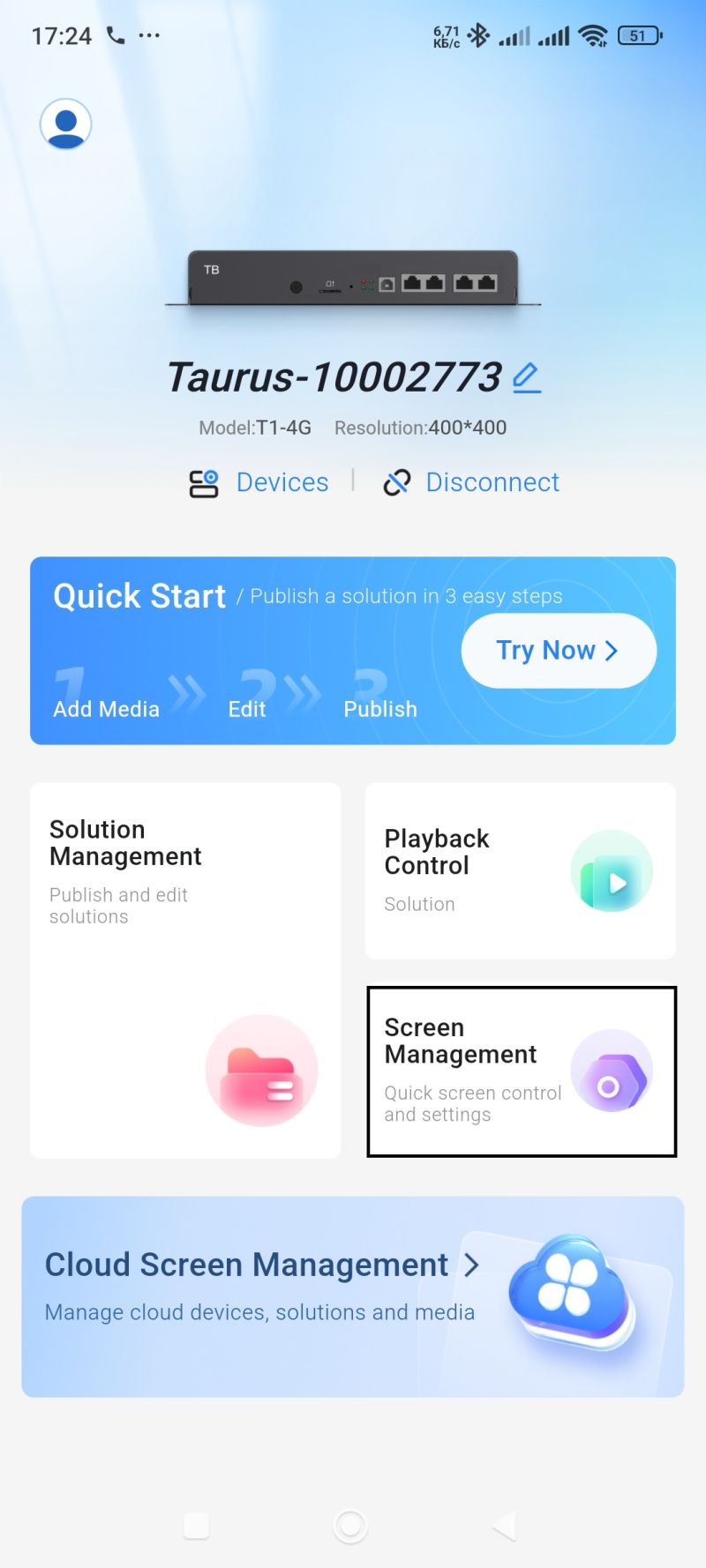 Для активации приложения SmartPlayer на устройстве пользователю необходимо в приложении перейти в раздел "Terminal Contorl" и выбрать блок "Playback Managment".