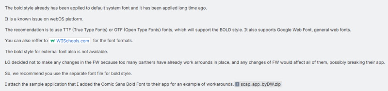 [The bold style already has been applied to default system font and it has been applied long time ago. It is a known issue on webOS platform. The recomendation is to use TTF (True Type Fonts) or OTF (Open Type Fonts) fonts, which will support the BOLD style. It also supports Google Web Font, general web fonts. You can also reffer to W3Schools.com for the font formats. The bold style for external font also is not available. LG decided not to make any changes in the FW because too many partners have already work arrounds in place, and any changes of FW would affect all of them, possibly breaking their app. So, we recommend you use the separate font file for bold style. I attach the sample application that I added the Comic Sans Bold Font to their app for an example of workarounds.scap_app_byDW.zip ]