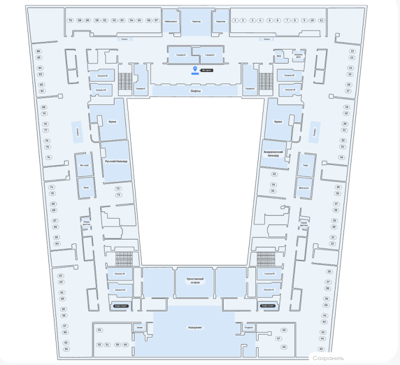 - объекты фильтрации для быстрого построения маршрута (коворкинг, принтер, гардероб и прочие), которые при клике отрисуют маршрут до ближайшего объекта. Располагается под списком этажей.