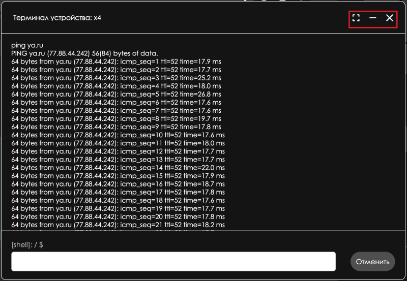 В терминале используются Shell-команды. Одиночные команды в терминале выполняются единоразово. Если команда продолжительная по времени действия (например ping), то информация от этой команды периодически выводится в окне терминала. Терминал в интерфейсе удаленного управления работает как модальное окно и отображает информацию с логами об устройстве. С помощью иконок его можно: