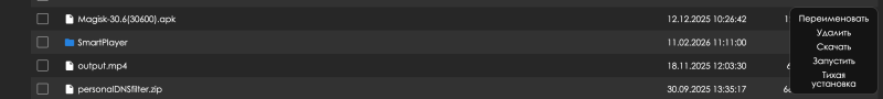 - APK-файлы — доступны команды: переименовать, удалить, скачать, запустить, тихая установка (фоновая установка);