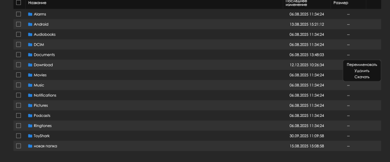 - папки — доступны команды: переименовать, удалить, скачать;