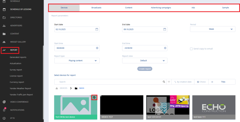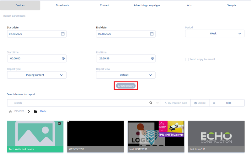 - выборка — позволяет собрать отчёт по отдельному устройству, проигрываемой на нём трансляции и конкретному контент.