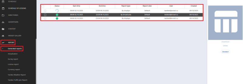 Как только процесс формирования отчёта начнётся пользователя перенесет на страницу сформированных отчётов "Generated reports"(«Сформированные отчеты»).