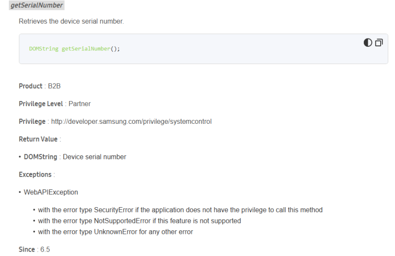 Пример отображения информации и описания параметра "getSerialNumber" из API Tizen OS