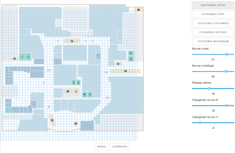 Примечание 1: при постановке точки магазина на сетке рекомендуется отстраивать сетку так, чтобы точка магазина занимала клетку полностью или хотя бы большую часть клетки. Иначе, возможна ситуация что из-за миниатюрности выставленной точки пользователь не сможет активировать ее кликом. Это актуально для таких помещений как павильоны. Это приведет к неудобству при использовании виджетом пользователями в ТЦ.