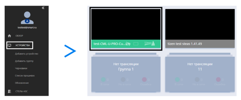 Для этого необходимо перейти в раздел "Устройства" и найти нужное on-line устройство.