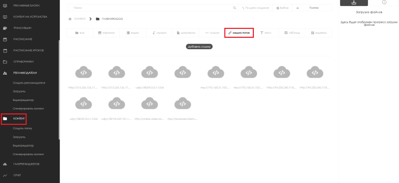 Следующим шагом перейти в раздел «Контент» и найти категорию «Медиа поток».