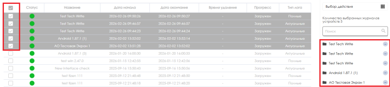 Пользователь может выбрать сразу несколько задач (логов) выделив их с помощью чекбоксов (галочек). Все выделенные задачи отобразятся в правой верхней части экрана и откроется панель управления для выделенных задач.