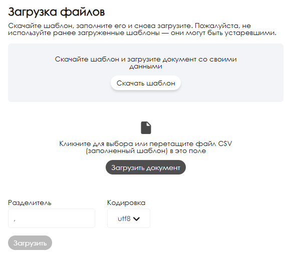 • кнопка «Загрузить» и поле для загрузки шаблона с помощью drag-and-drop (перетаскиванием из папки пользователя);