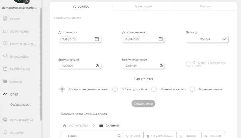 Просмотр отчётов Proof of Play по различным параметрам, статистика по работе устройств