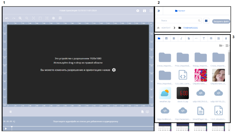 - Content working area - content needed by the user is added inside this area. After adding content, double-clicking the mouse opens additional settings for the content working area. In the opened settings, the following parameters can be set: "Arrange content continuously over time" checkbox, "Content looping mode in the area" checkbox, set the playback order, content name, content start time, duration, layer level, frequency of appearance, left and right margins, content width and height, transparency.