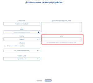 Для добавления тегов на устройство происходит при первичном добавлении устройства в систему в окне "Дополнительные параметры устройства". Так же можно добавить теги на уже существующие в системе устройства, для этого: