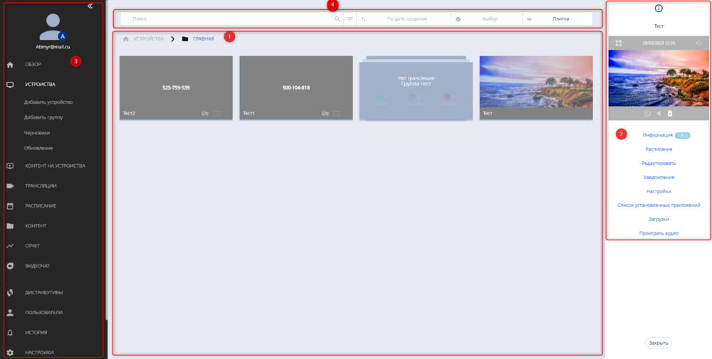 - Основная область. Отображает добавленные устройства и группы. Цвет устройства/группы характеризует состояния устройств. Зеленый - устройство online. Серый - устройство offline. Красный - ошибка на устройстве.