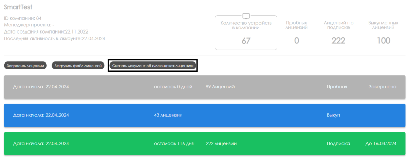 - Просмотреть сводку с информацией по лицензиям и кликнуть на кнопку "Скачать документ об имеющихся лицензиях".