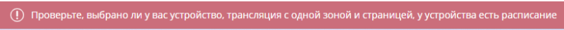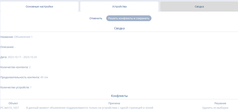 В этой зоне прописана информации о конфликтах объявления с устройством или трансляцией, которые необходимо решить. Если данные конфликты не решить, то создать объявление, после нажатия клавиши "Решить конфликты и сохранить" будет невозможно. О проблеме предупредит специальная всплывающая строка.