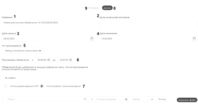 - После наступления верхний границы временного промежутка объявления завершается и обратно запускается трансляция