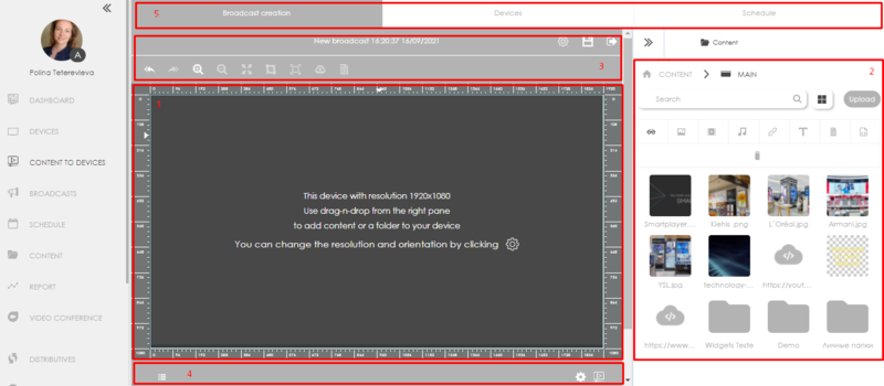 - Create a broadcast (playlist) using the editor by dragging and dropping different content using drag & drop and various tools.