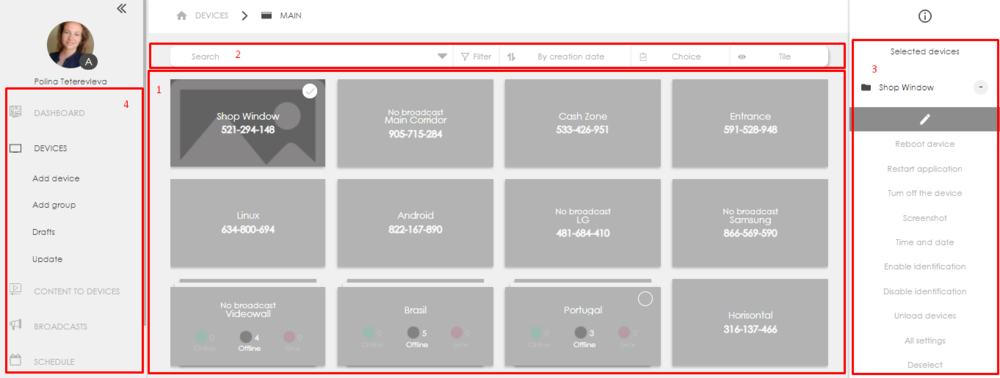 - Navigation menu. Used to navigate to other sections and to perform additional actions such as adding a device or group.