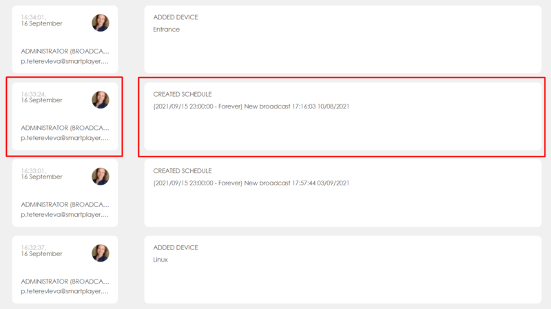 The SmartPlayer platform logs all actions on the server with the subsequent ability to view and download the record from the system. The following data is logged: