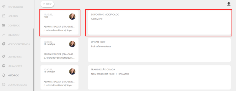 A plataforma SmartPlayer registra todas as ações no servidor com a capacidade subsequente de visualizar e baixar o registro do sistema. Os seguintes dados são registrados:
